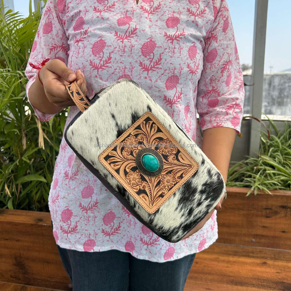 New Hand Tooled Leather Travel Toiletry Bag Large Capacity Turquoise Stone Cosmetic Bags Cowhide Portable Storage Makeup Bags
