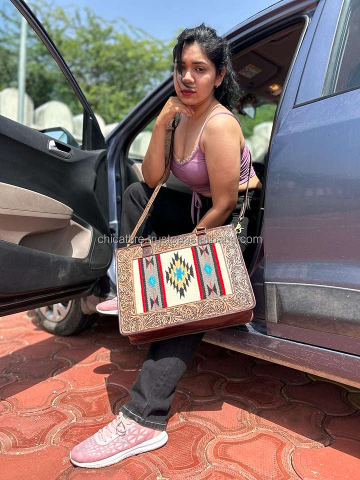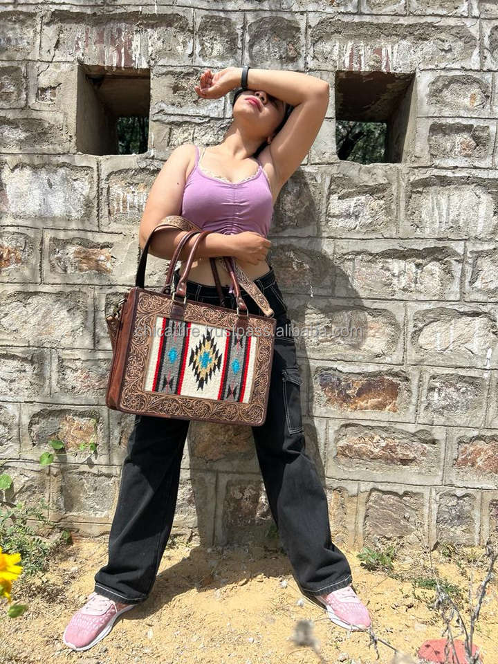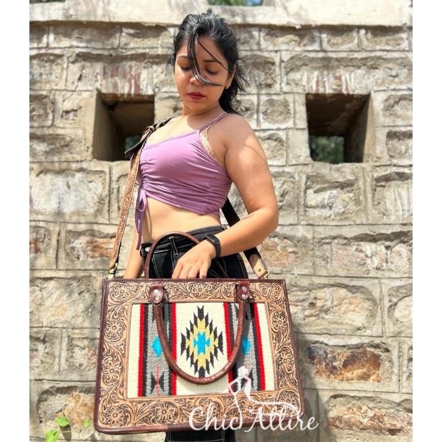 New Hand Tooled Saddle Blanket Concealed Carry Large Tote Bags for Women's Genuine Leather Crossbody Purse Aztec Carpet Handbags