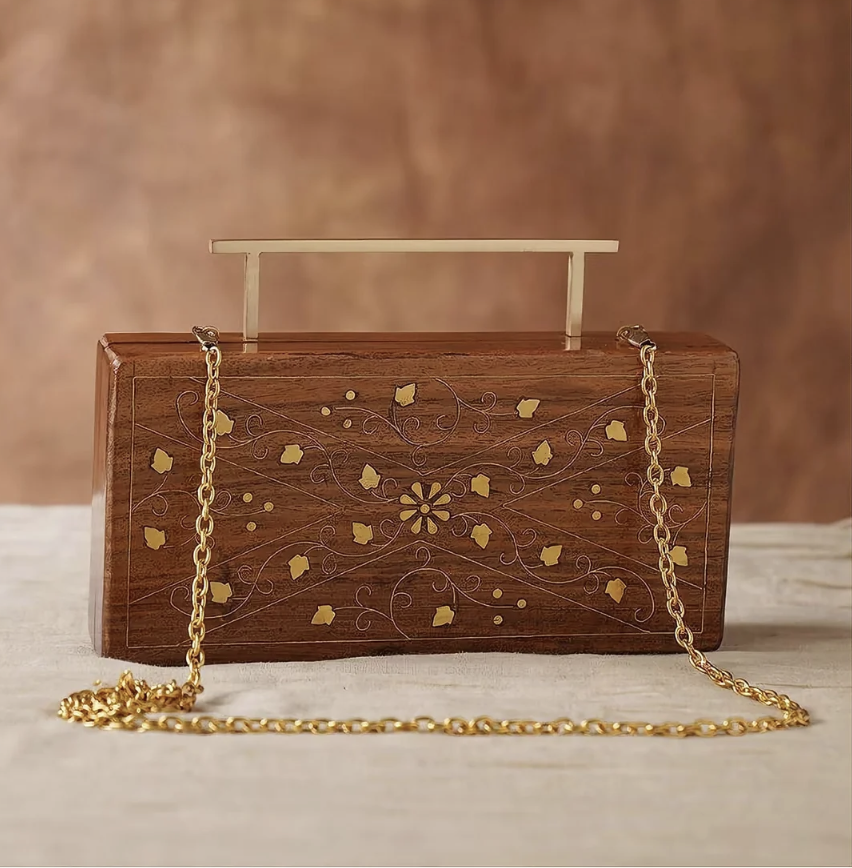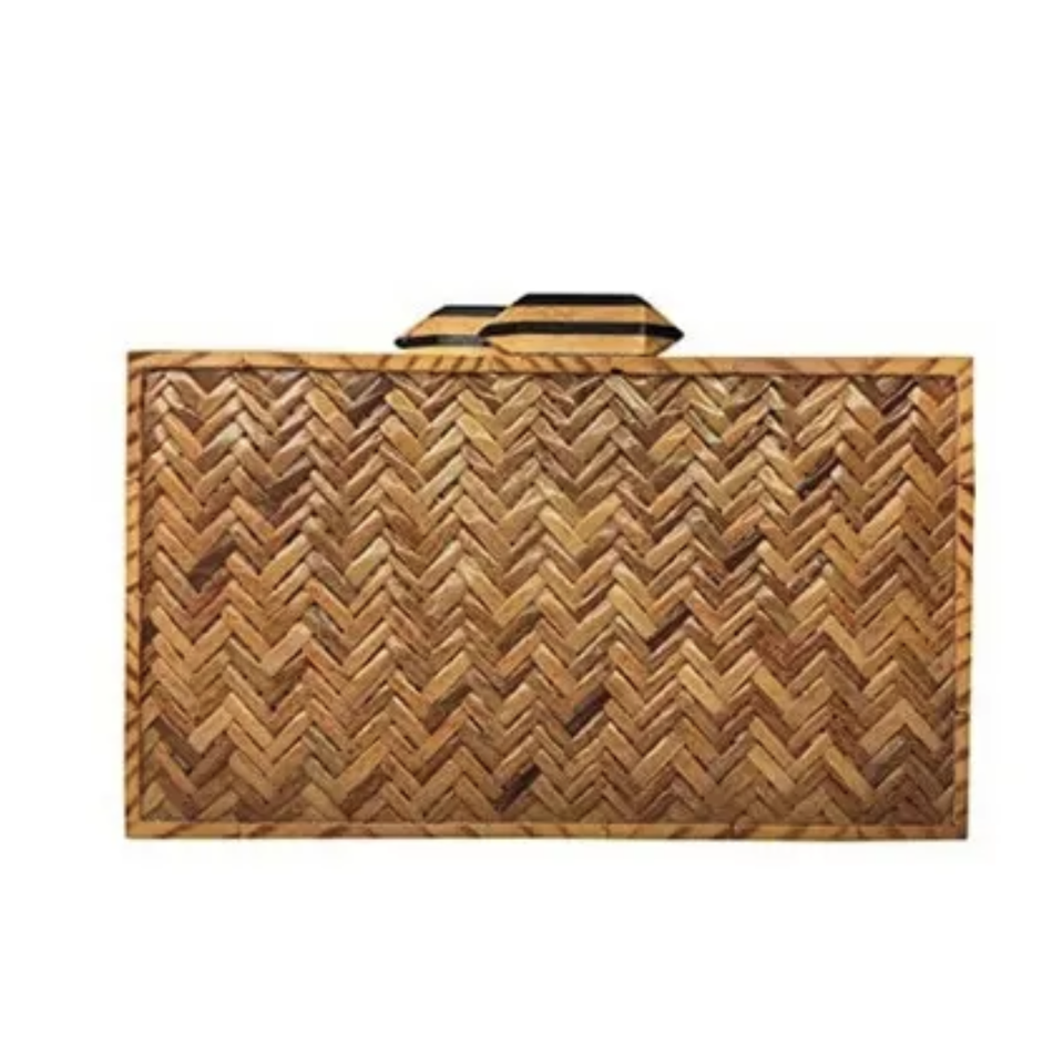 New Handcrafted Bohemian Fashion Wooden Clutch with RFID Protection and Metallic Sling Closure Summer Beach Woven Handbag