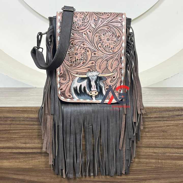 Hand Tooled Cowhide Leather Fringe Crossbody Bag