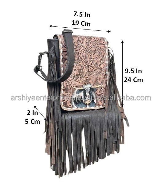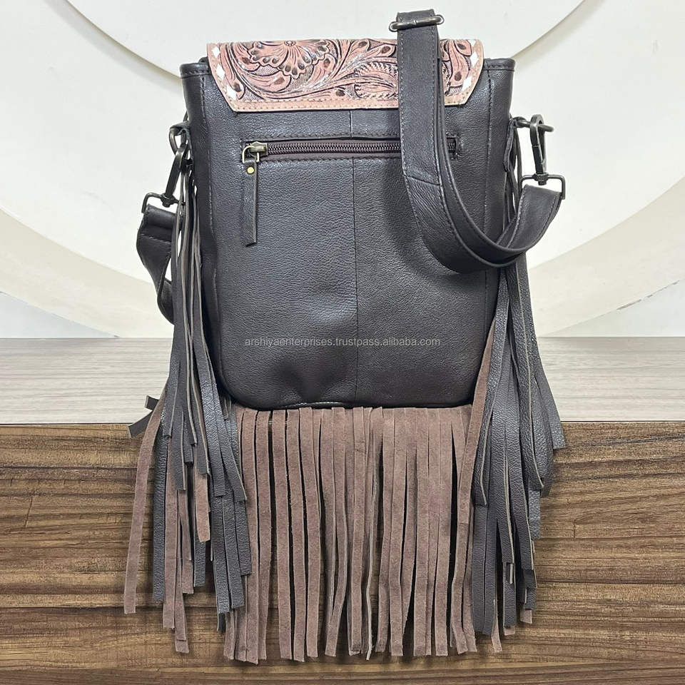 New Handcrafted Tooled Cow Leather Fringe Crossbody Sling Bag Elegant & Fashionable Western Style Women Shoulder Purse Hand Bag