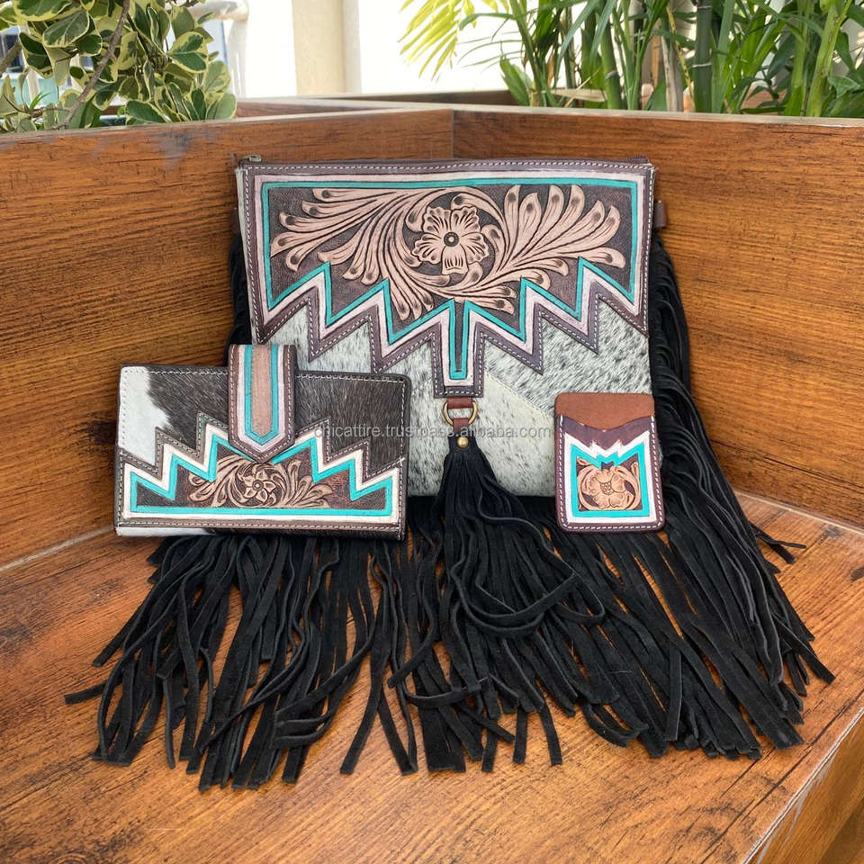 New Handcrafted Tooled Leather Cowhide Trio Set Crossbody Purse Floral Wallet Card Holder Fringe Inspired Logo Tote Bag Pattern