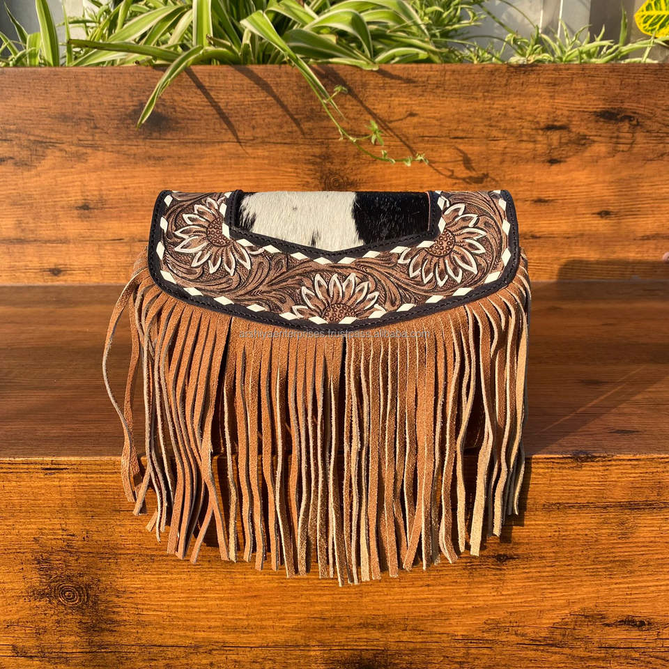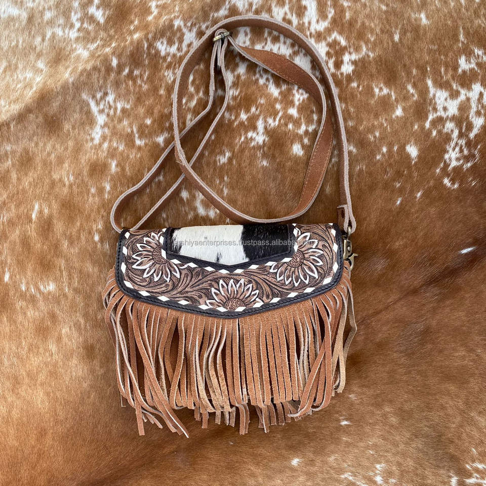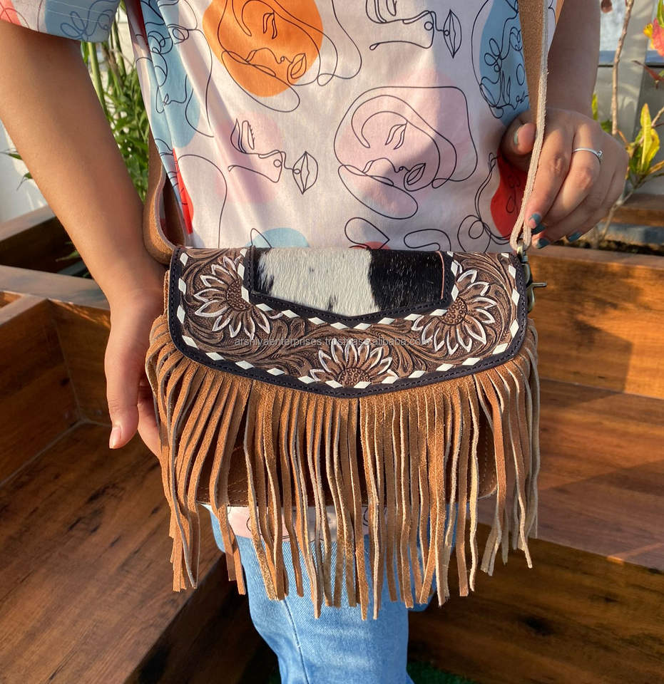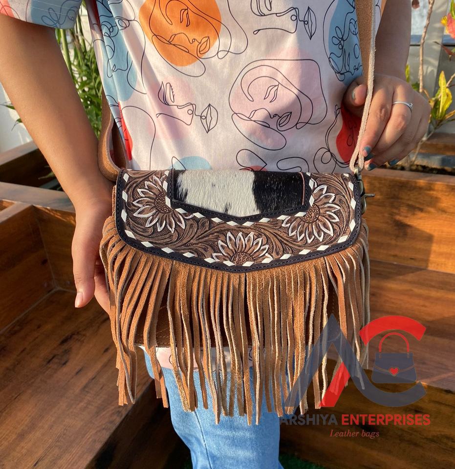 New Handcrafted Tooled & Tan Suede Leather Fringe Small Crossbody Bag for Women's Western Hair on Cowhide Floral Shoulder Purse
