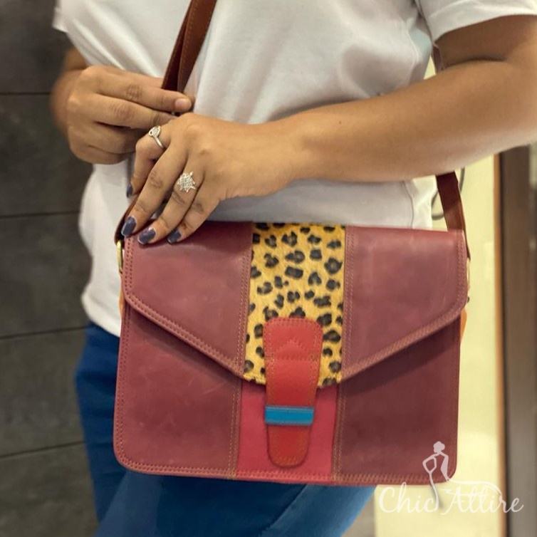 New Handcrafted Women Genuine Recycled Animal Print Fur Leather Stubby Color Handbag Unique Rainbow Color Shoulder Crossbody Bag