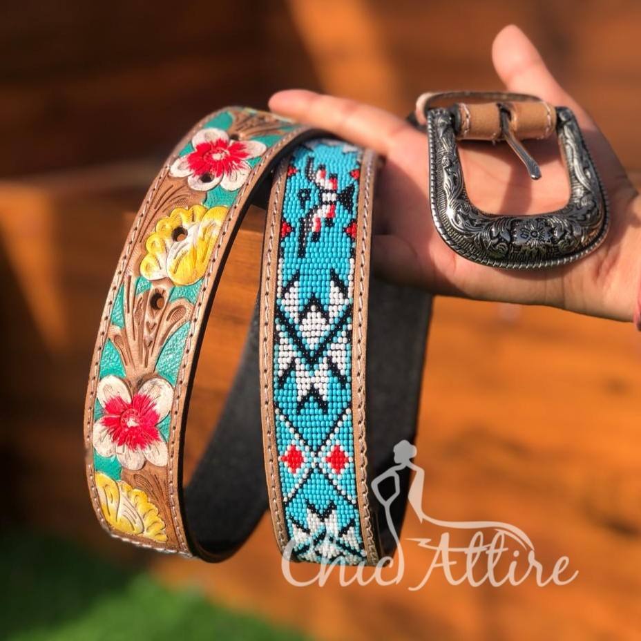 New Handmade Beaded Tooled Leather Carving Belts Available in All Sizes Bohemian Western Design with Vintage Flair