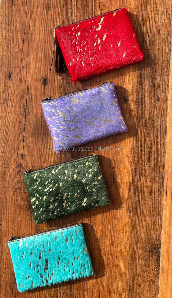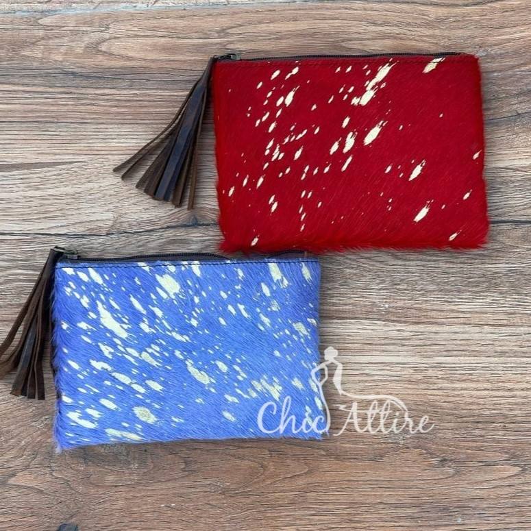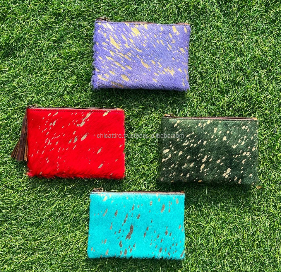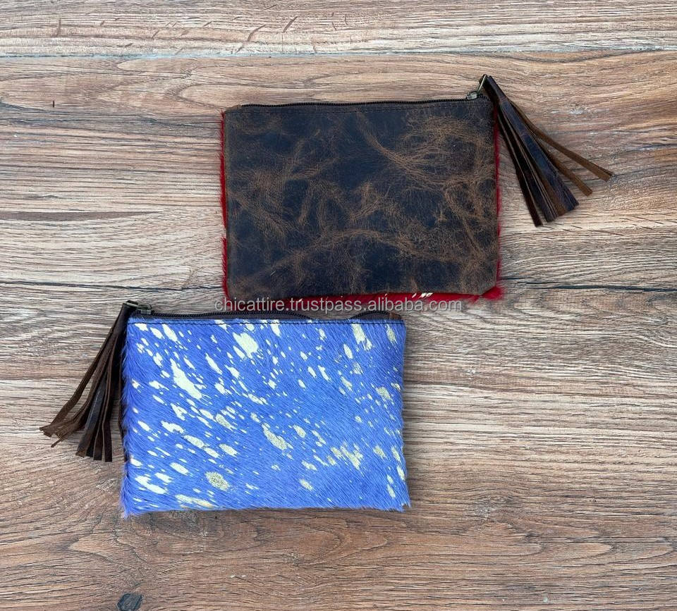 New Handmade Hair on Metallic Cowhide Leather Tassel Pouch Western Genuine Leather Credit Card Phone Zipper Wallets for Women's