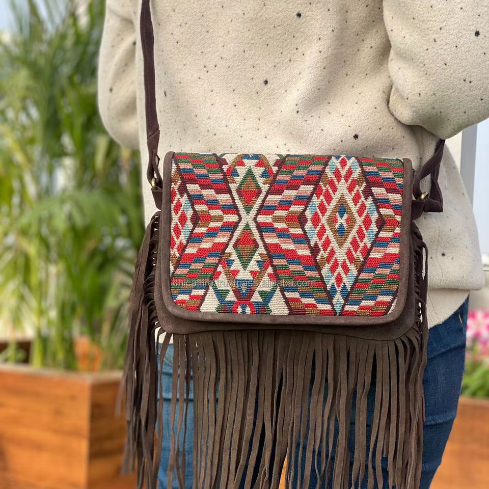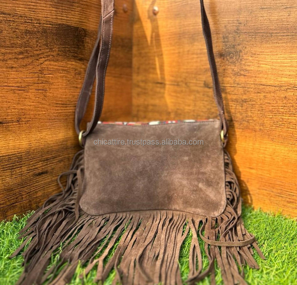 New Handmade Hot Sale Jacquard Suede Leather Fringe Sling Bag Multi Use New Vintage Design Crossbody Bag Cheap Rate Bulk Product