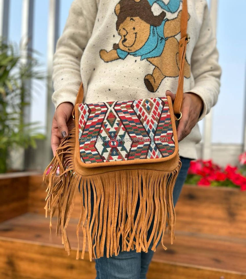 New Handmade Hot Sale Jacquard Suede Leather Fringe Sling Bag Multi Use New Vintage Design Crossbody Bag Cheap Rate Bulk Product