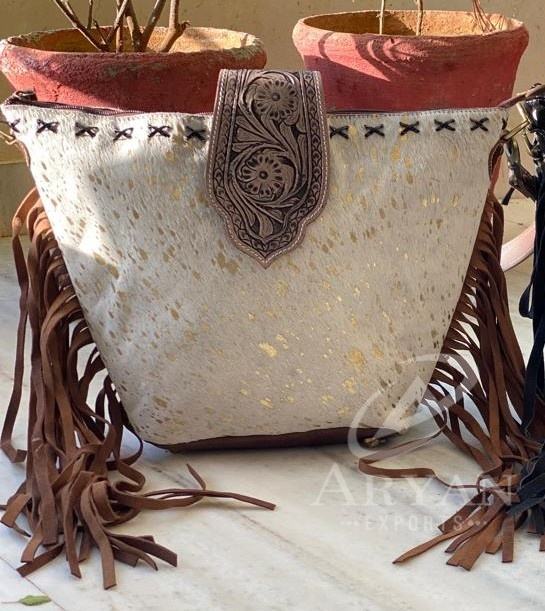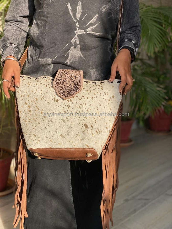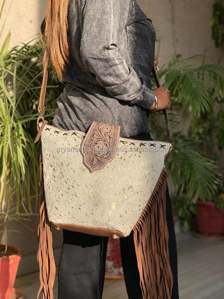 New Handmade Real Hair on Metallic Tooled Leather Women Hobo Crossbody Purse Custom Genuine Cow Leather Conceal Carry Handbags