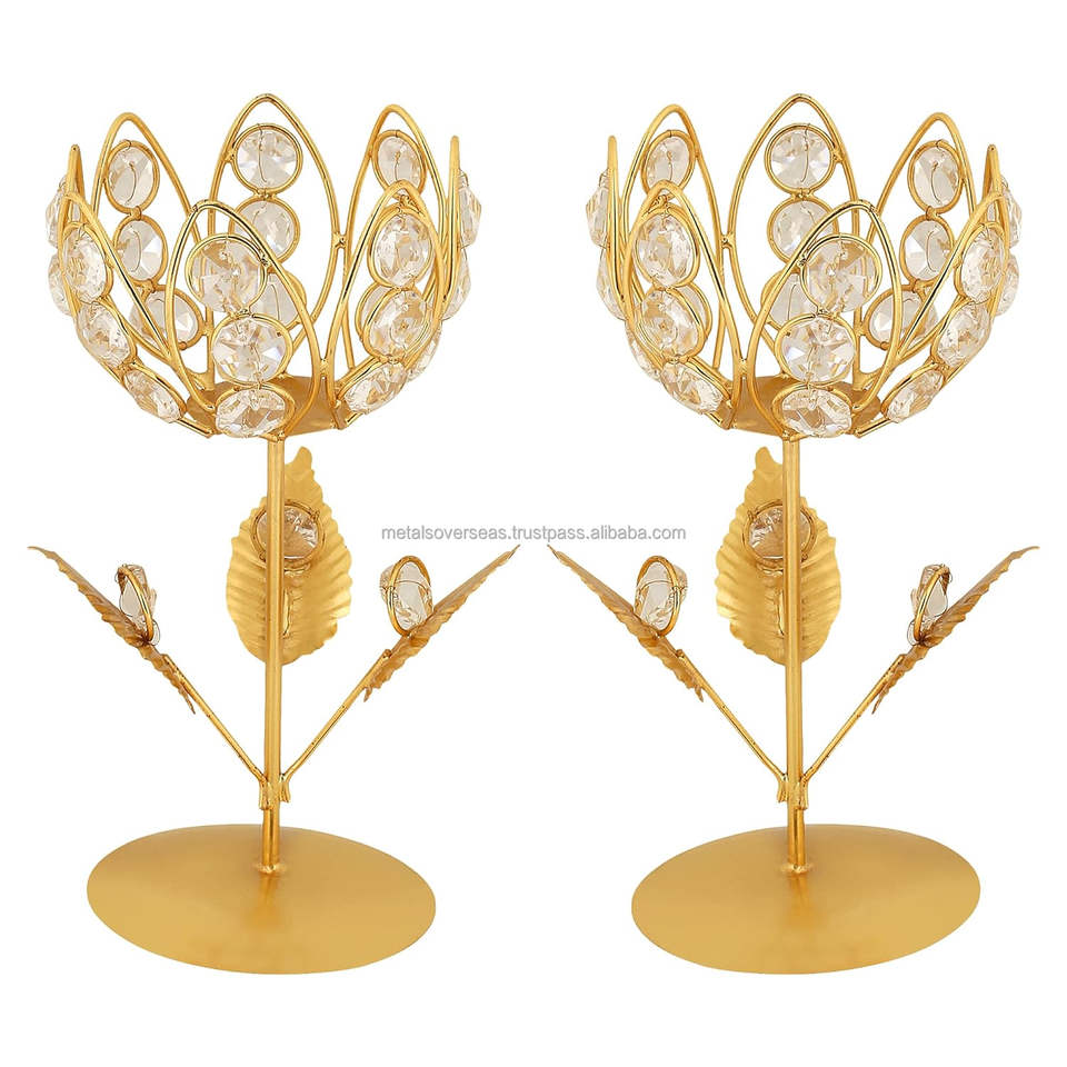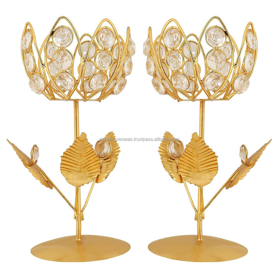 New Handmade Stylish Golden Metal and Crystals Candle Votive Set of 2 With Great Quality Gold Stand and Design at Very Low Rates