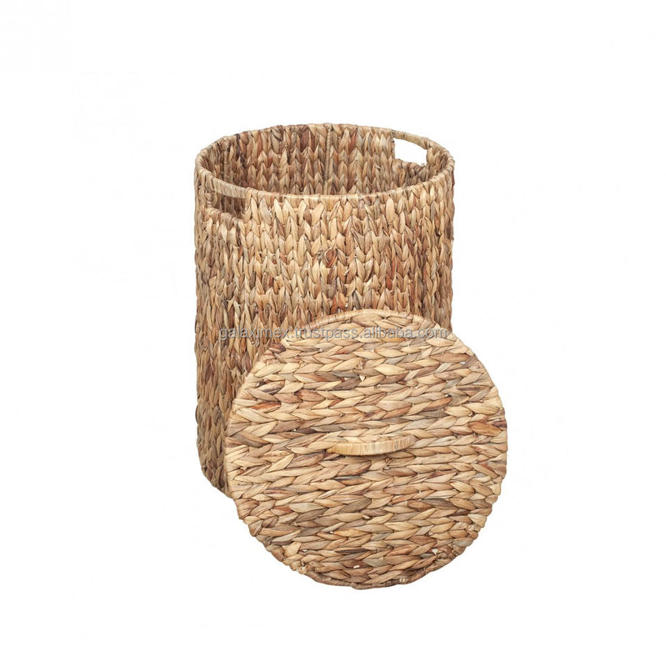 New Handwoven Natural Water Hyacinth Wicker Laundry Basket with Lids Metal Fabric/Cloth Bag for Storage