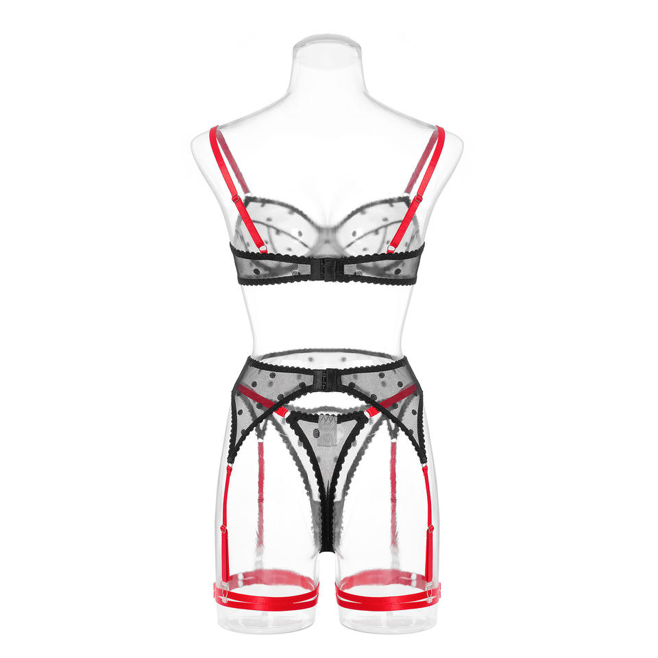 New High Quality Contrast Color Transparent Mesh Lingerie Set Sexy Polka Dot Three Piece Bra Brief Set