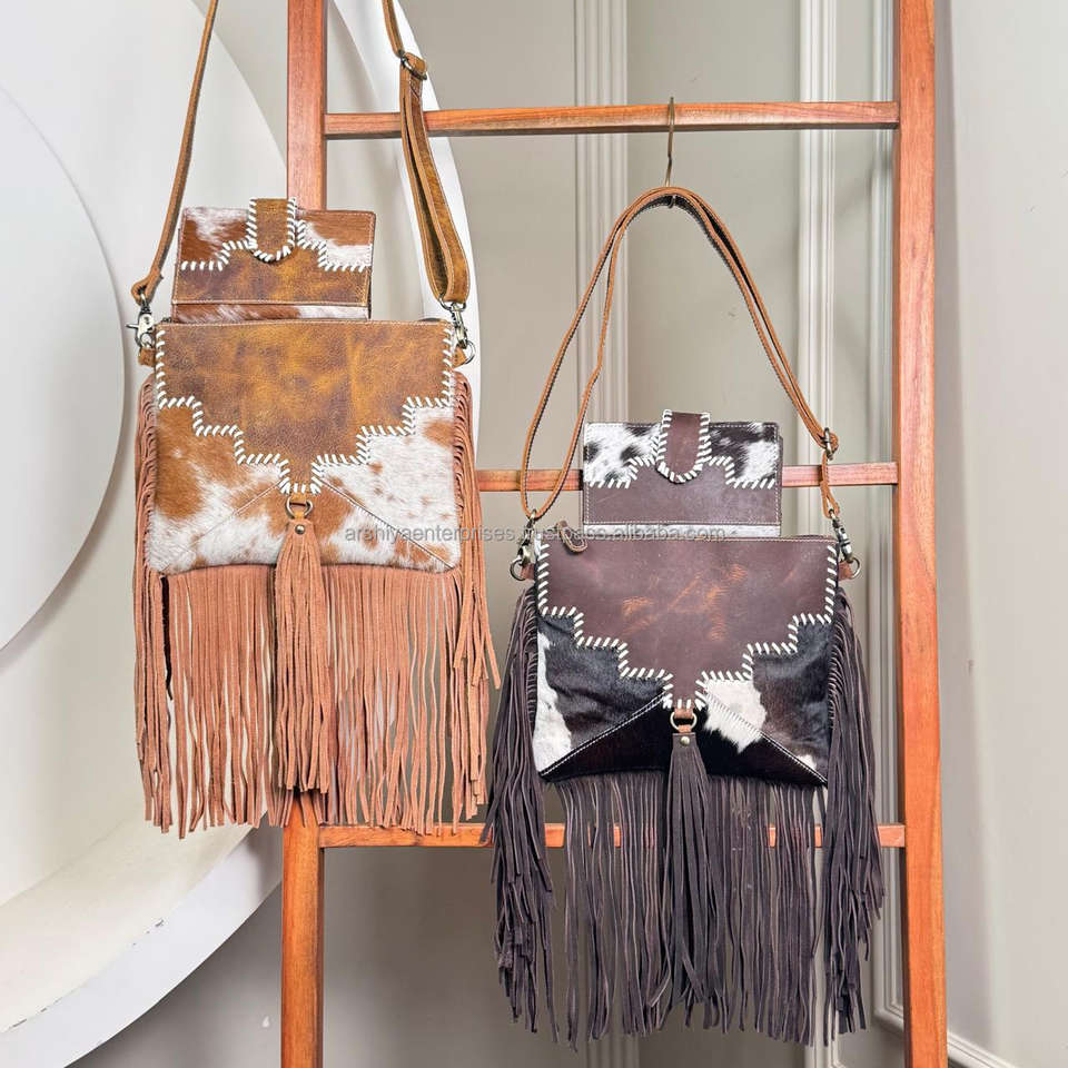 New High Quality Hand-Stitch Leather Cowhide Fringe Crossbody Bags & Genuine Cowhide Leather Bifold Wallet Set 2 Pcs for Women's