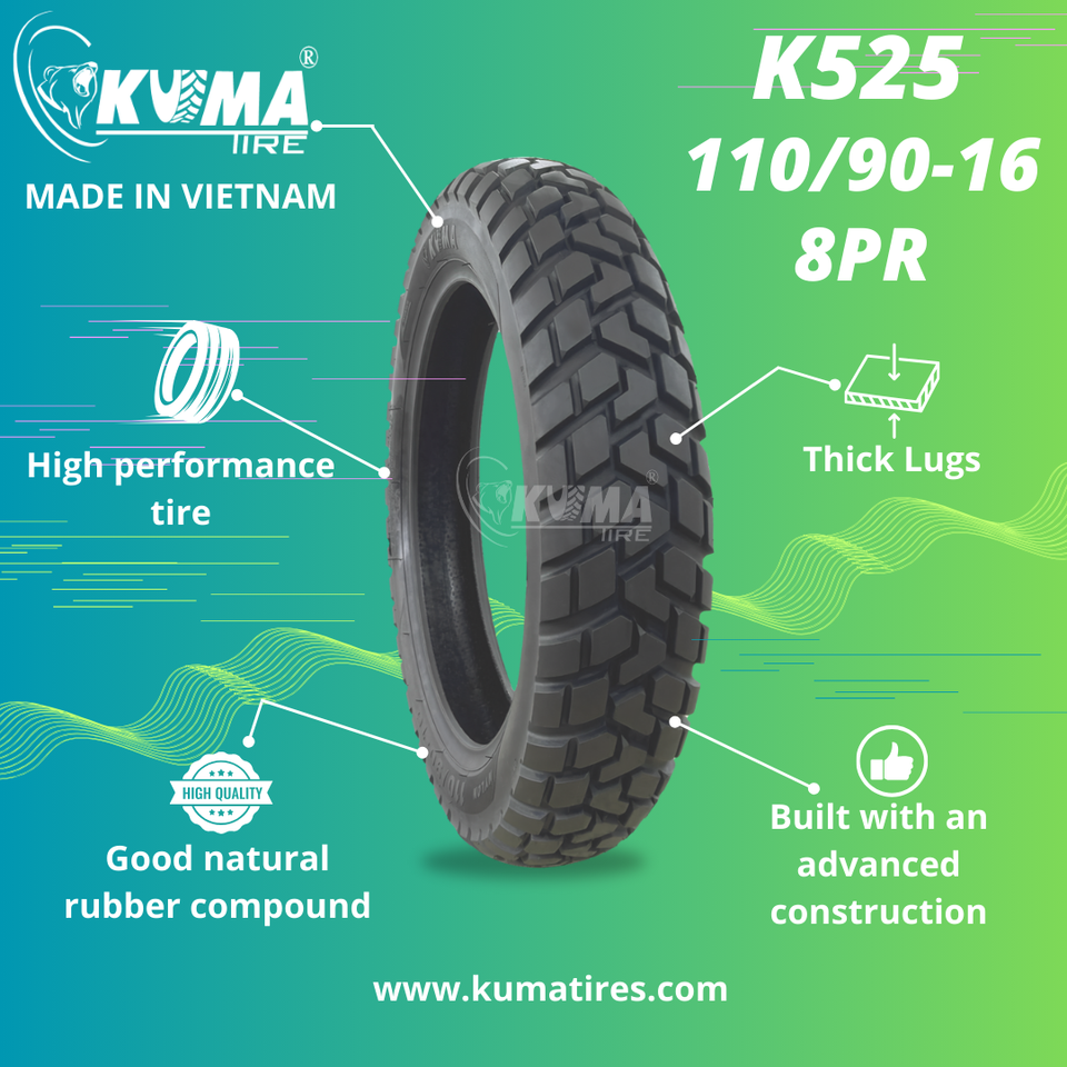 New High-Traction Performance KUMA K525 Deep-Knob Anti-Slip Rubber Tubeless Tyre 110/90-16 Motorcycle Tire Off-Road Black