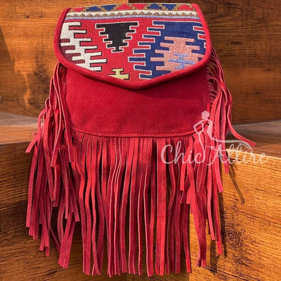 Jacquard Fabric Suede Leather Fringe Sling Bags