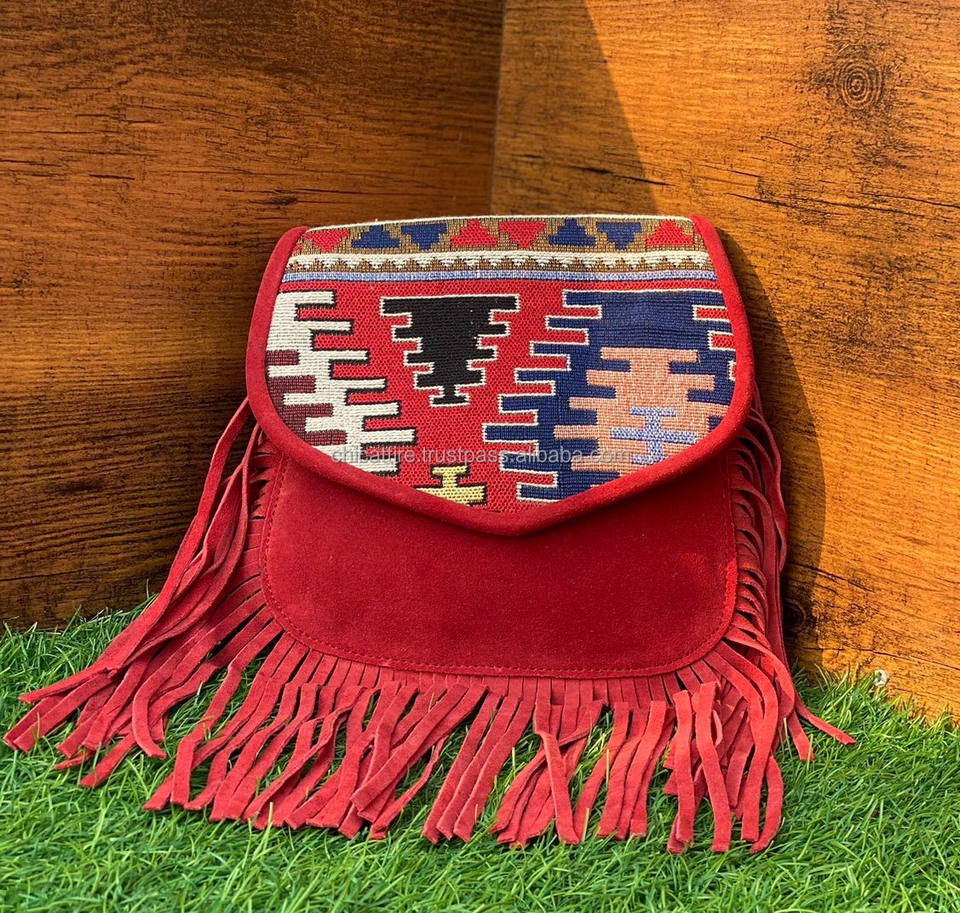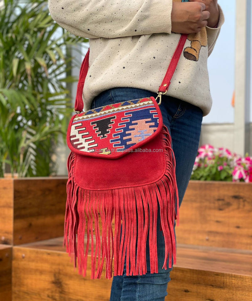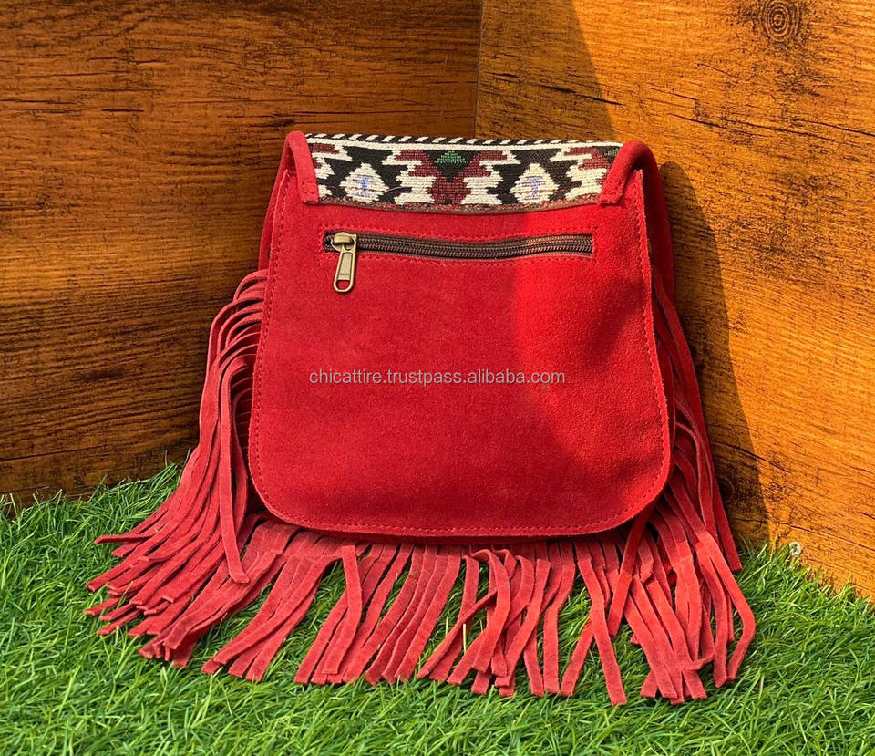New Hot Sale Jacquard Fabric Suede Leather Fringe Sling Bags Multi Use New Vintage Design Crossbody Bag Cheap Rate Bulk Products