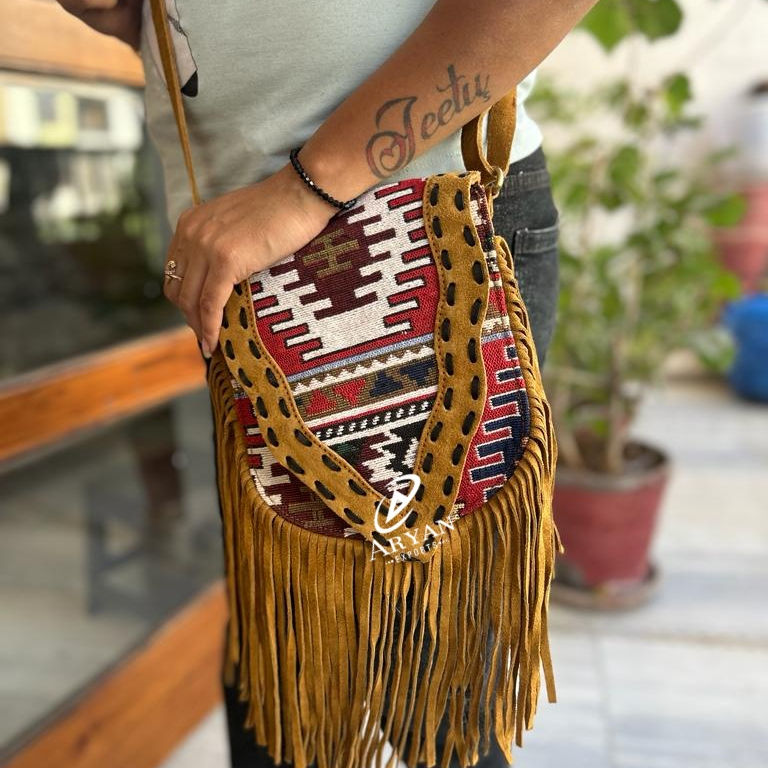 New Hot Sale Jacquard Handmade Suede Fringe Leather Sling Bag Multi Use New Vintage Design Crossbody Bag Cheap Rate Bulk Product