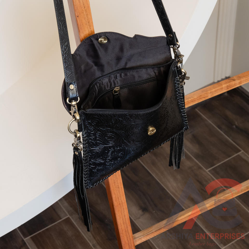 Hot Selling Real Genuine Tooled Embossed Leather Compact Tassel Sling Bags Women High Quality Unique Carved Leather Handbags