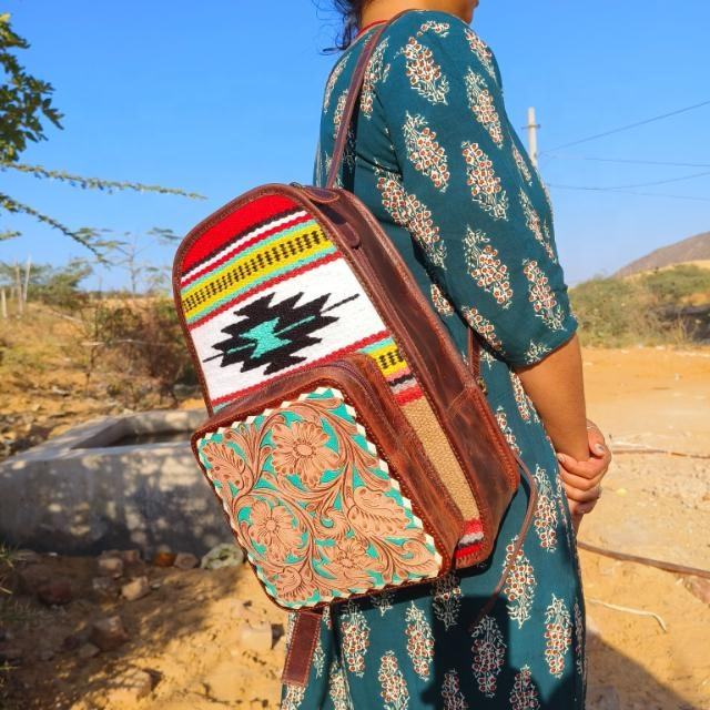 Hot Selling Genuine Leather Western Women Backpack Hand Tooled Saddle Blanket Kilim Water Resistant Portable Daily Use Vintage
