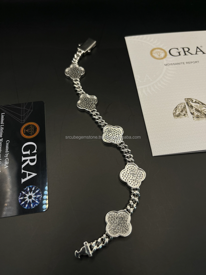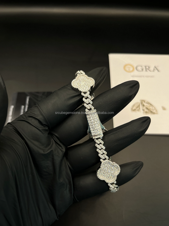 New Item Fashion Gift Jewelry 8mm 925 Sterling Silver VVS Moissanite Four Leaf Clover Cuban Bracelet for Valentine's Day
