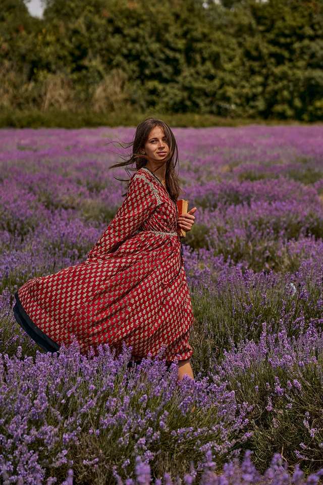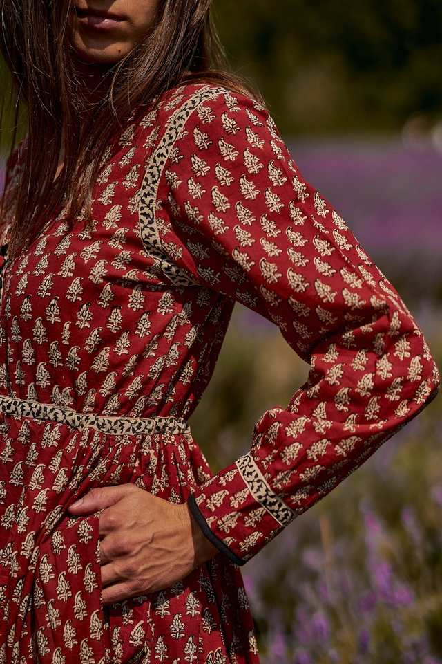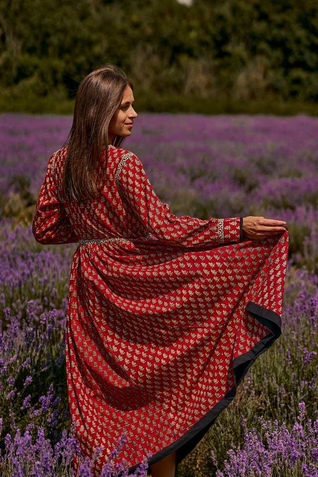 New Katie Bohemian Midi Dress Hand Block Printed Pure Cotton Black Cream Red Floral Handmade Ethical Casual Occasion Wear