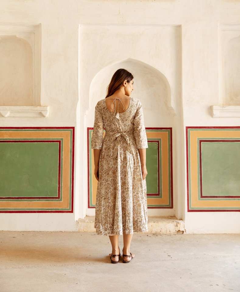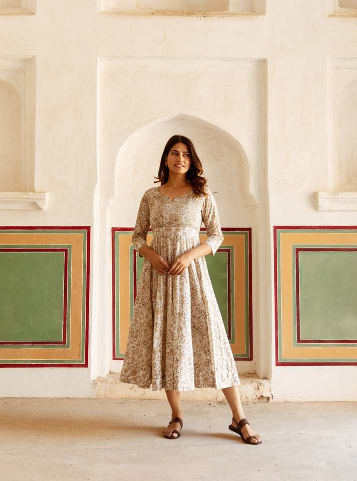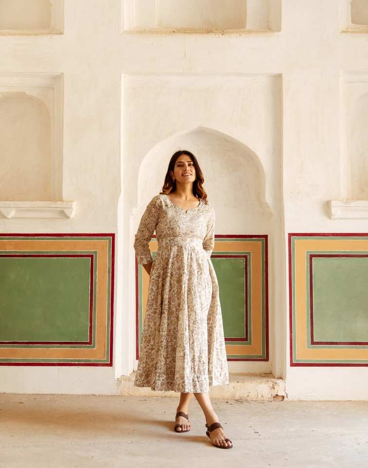 New Kirana Anarkali Dress Multi-Fabric Hand Block Printed White Beige Panelled Bohemian Handmade Ethical Washable Natural Daily