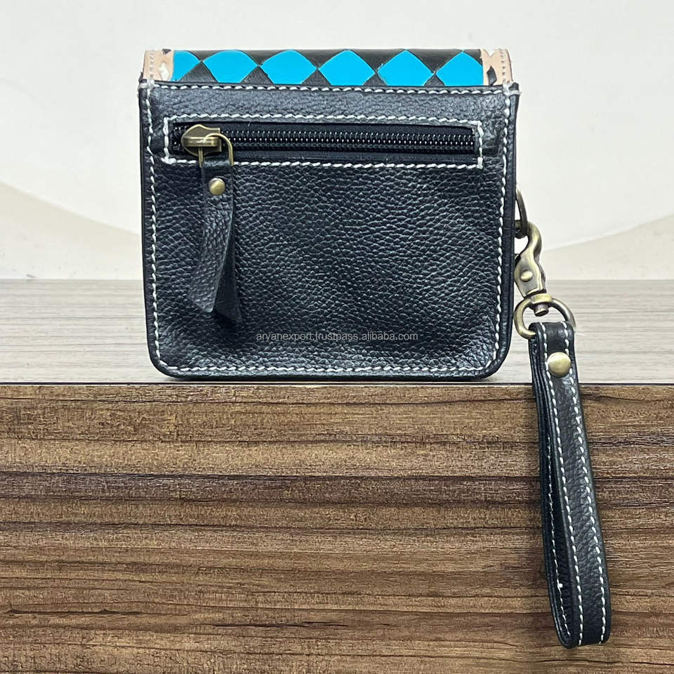 New Large Capacity 2025 Tooled Cowhide Leather Coin Purse Western Checkered Board Pattern Mini Wallet Small Clutch with Wristlet
