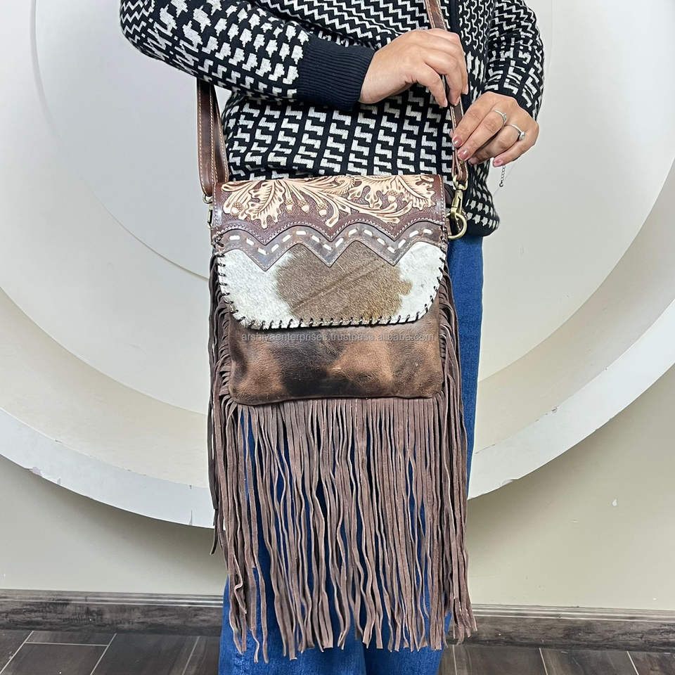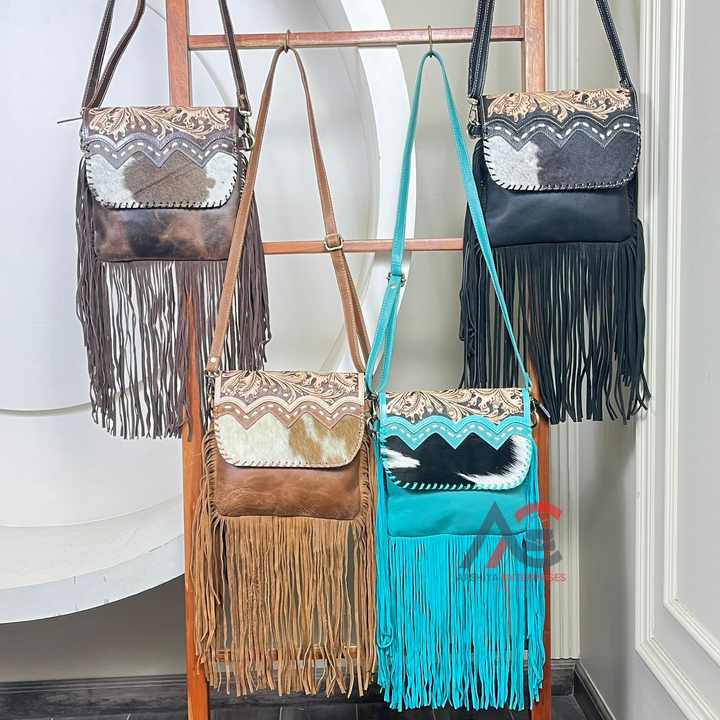 Product name:Hand Tooled Cowhide Leather Fringe Crossbody Bag