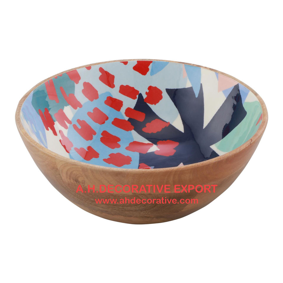 New Large Wooden Bowl With Enamel Flowers Finishing Serving for Rice & Popcorn for Table Top
