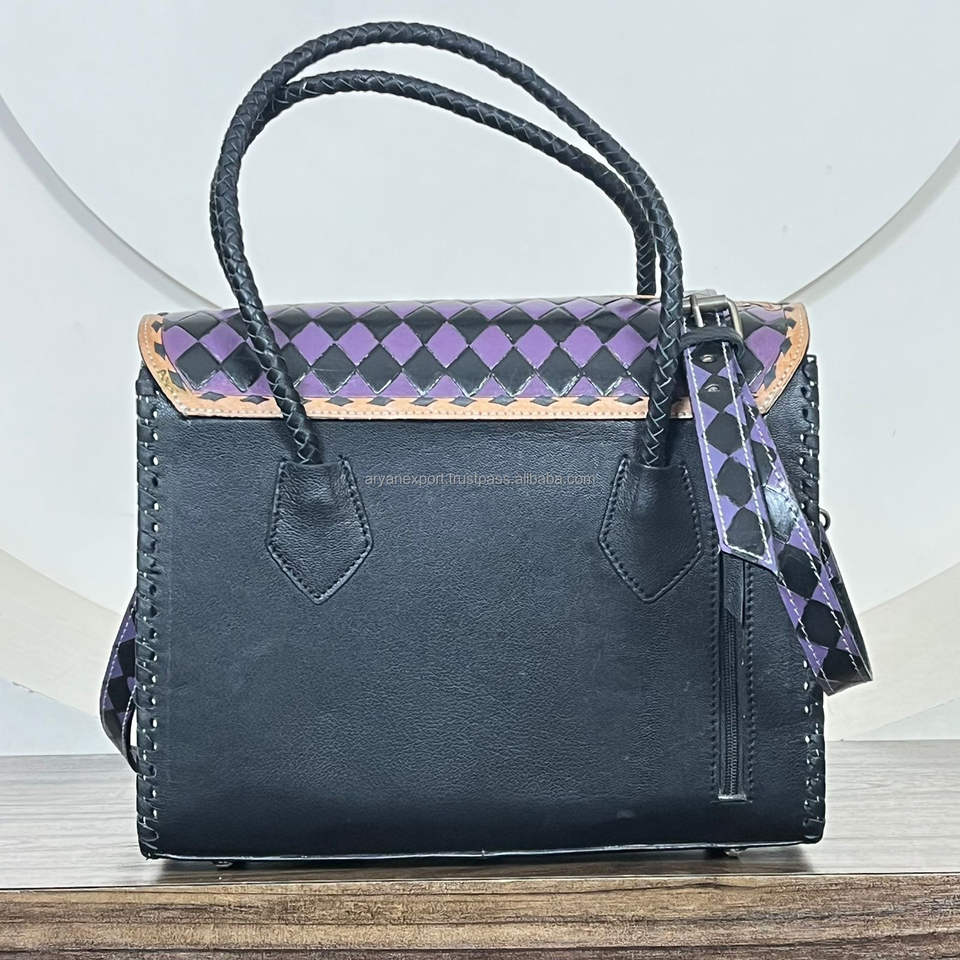 New Latest Style Fashion Elegant Large Hand Tooled Cowhide Leather Tote Bag Crossbody Checkered Pattern shoulder Purse for women