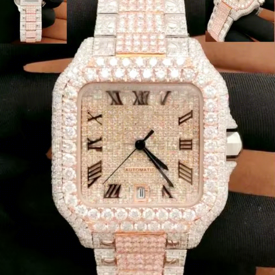 New Luck Real Moissanite Stainless Steel Rose Gold Two Tone Hip Hop Iced Out Automatic Movement Watch