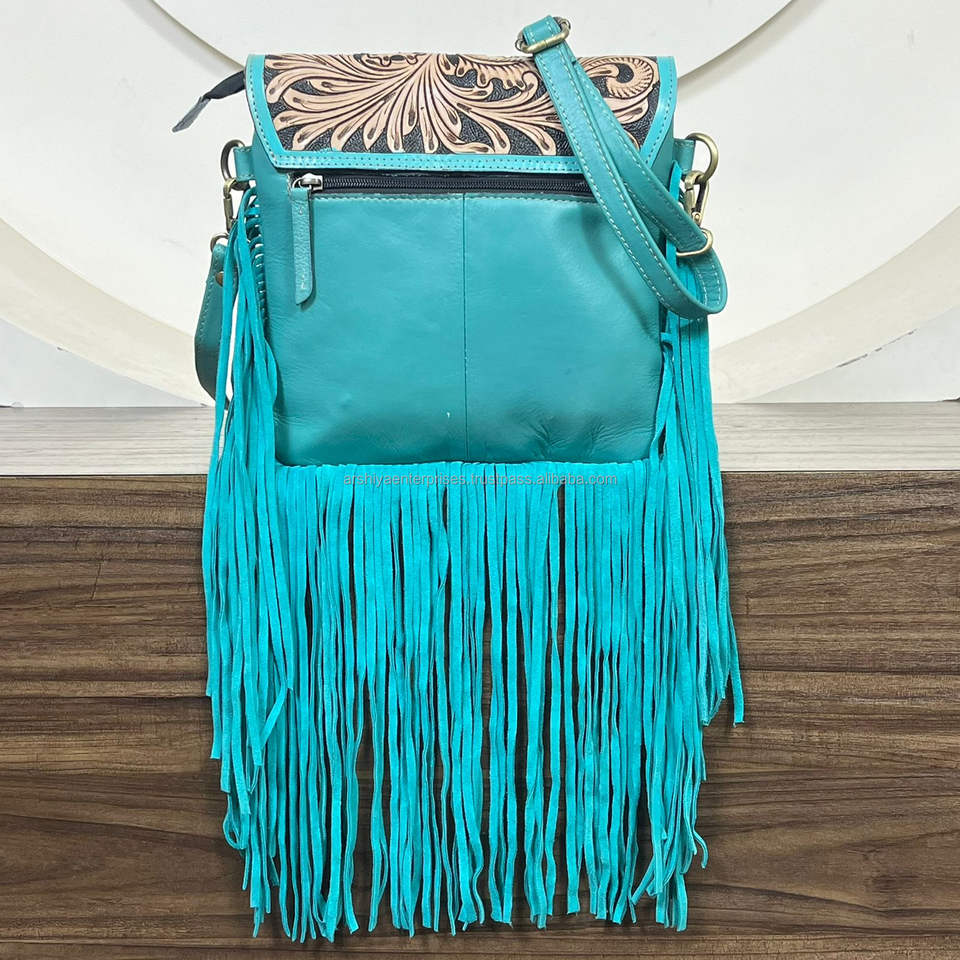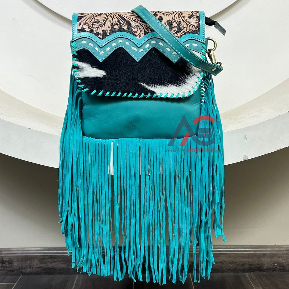 Hand Tooled Cowhide Leather Fringe Crossbody Bag