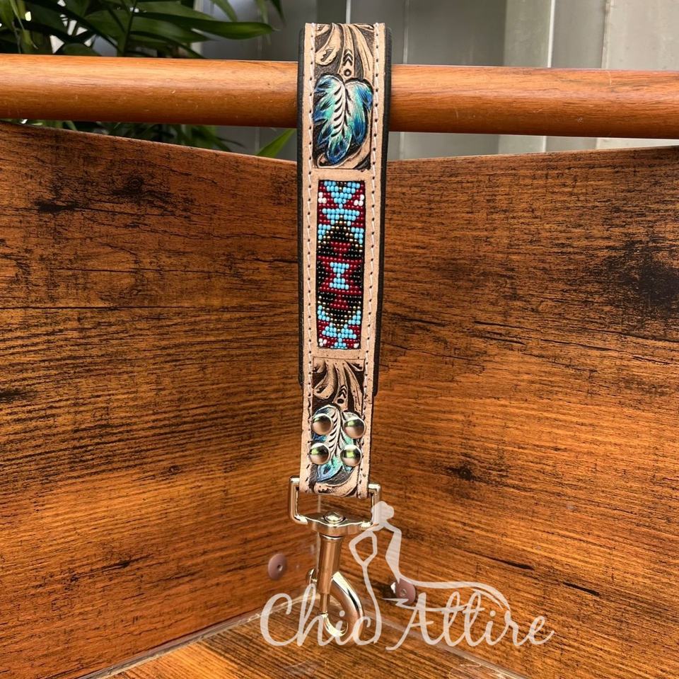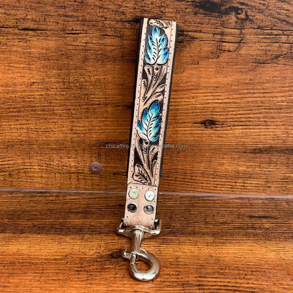 New Luxury Genuine Leather Tangle-free Padded Handle Traffic Lead Retractable Hand Tooled Beaded Dog Leashes with Anti-Slip Hook