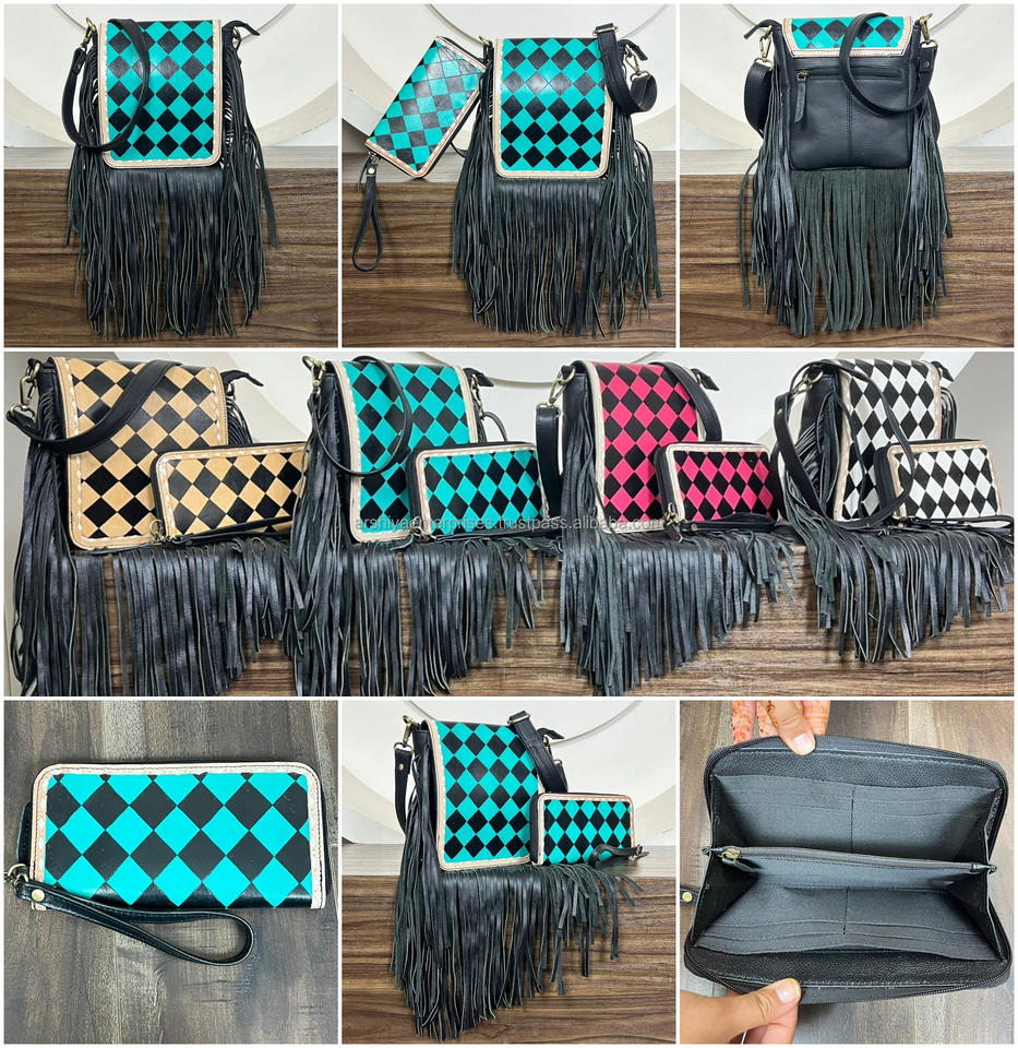 New Luxury Women's Large Capacity Hand Tooled Checkered Leather Fringe Shopping Shoulder Bag & Wristlet Clutch 2-Piece Combo Set