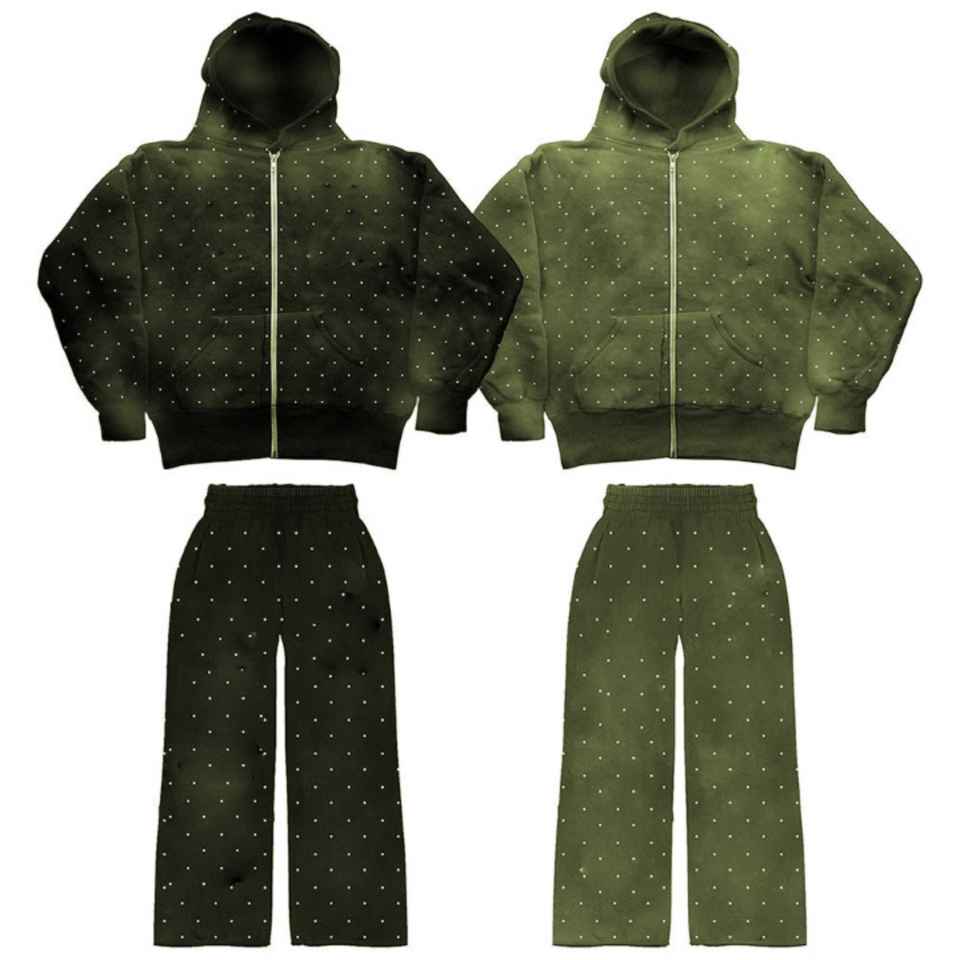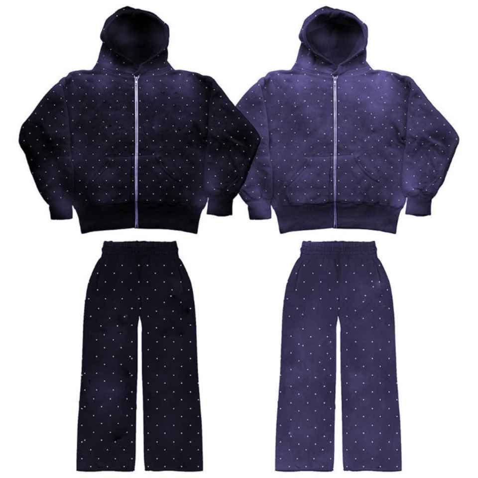New Men Hooded Plus Size Winter Zip-Up Distressed Acid Wash Two-Piece Tracksuit Set Jogging Suit with Rhinestone