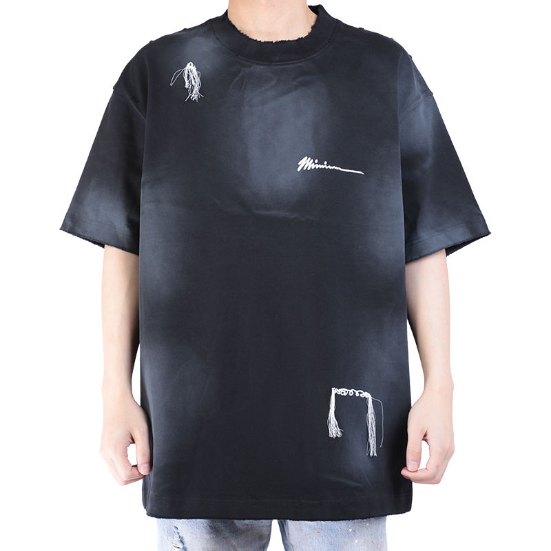 New Men'S Fashion 100% 320 grams T-Shirt Embroidered Fringe Irregular Holes Black And Blue Faded Men'S T-Shirt