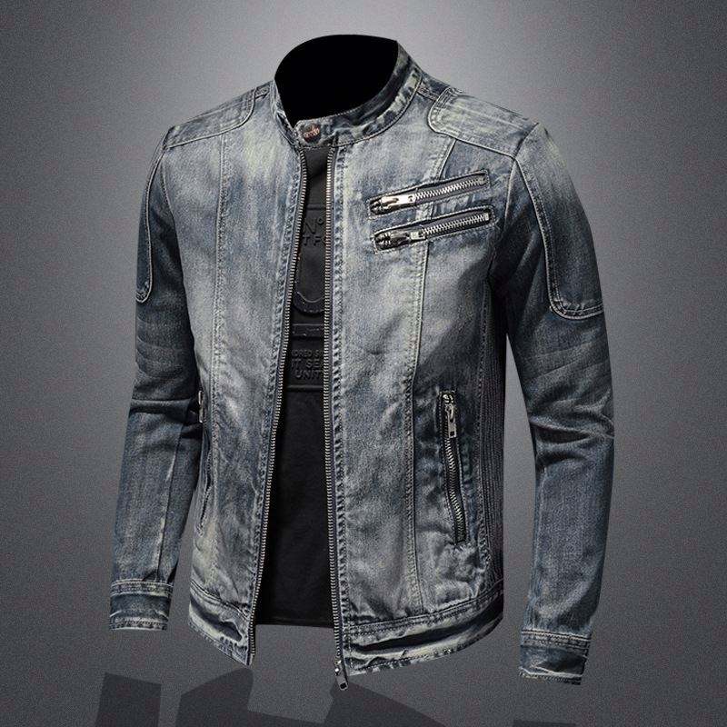New Men's Long Denim Windbreaker Jacket Trendy Retro Fashion Casual Stand-up Collar Zipper Handsome Riding Biker Clothing