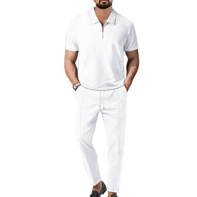 New Men's POLO Shirt 2 Sets Casual Fashion Commercial Breathable Lapel, Pants Pull Rope Solid Color Men 2 Sets