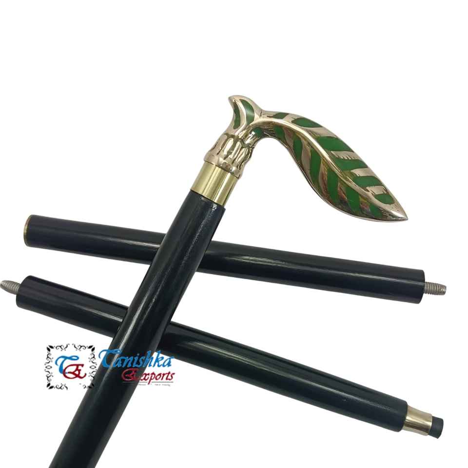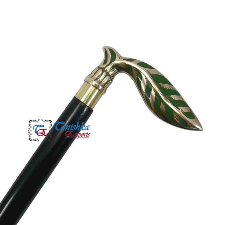 New Modern Handmade Black Wooden Walking Stick Brass Polish Green Leaf Design Handle Rubber Tip Outdoor Activities Gift