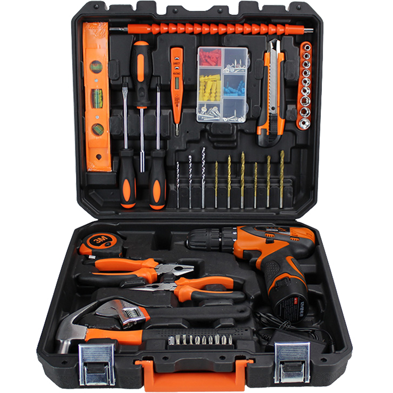 Twist Drill, Masonry Drill, Wood Drill, Bit ADA, 25mm Bit, Socket, A Screwdriver, Cross Screwdriver, Bit Handle, Utility Knife, electroprobe, Measuring Tape, Combination Plier, Long Nose Plier, Adjustable Wrench, Claw Hammer, Plastic joint flexible shaft, Spirit Level, Fastener box, Blow molding box, Cordless drilltool includes