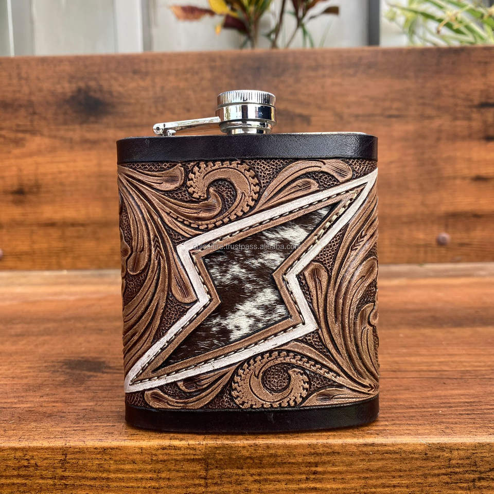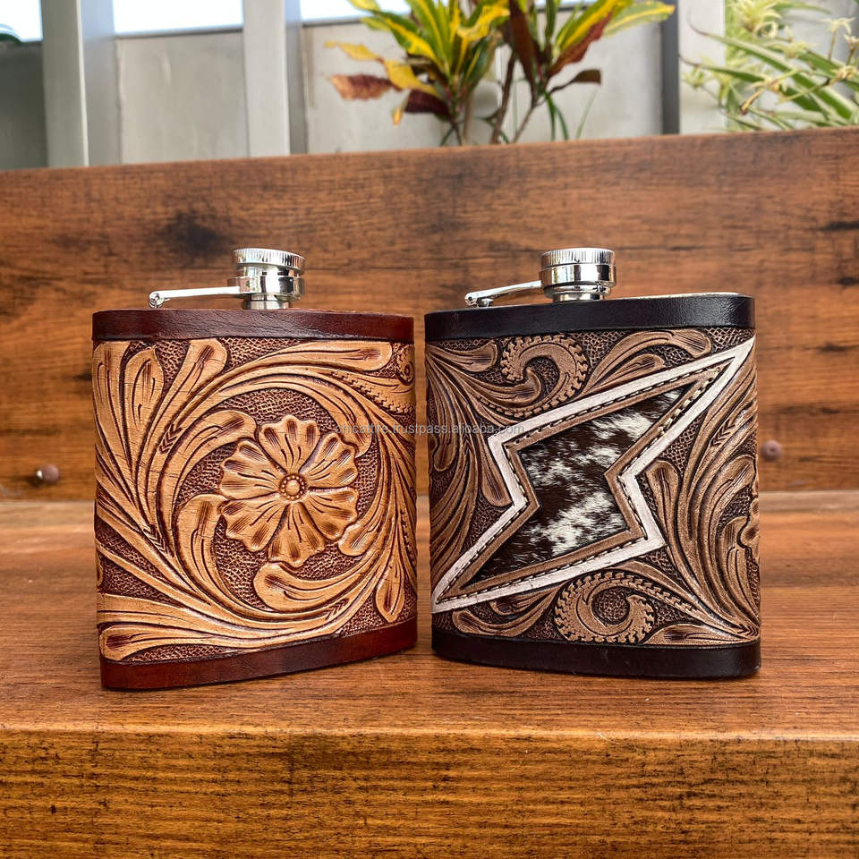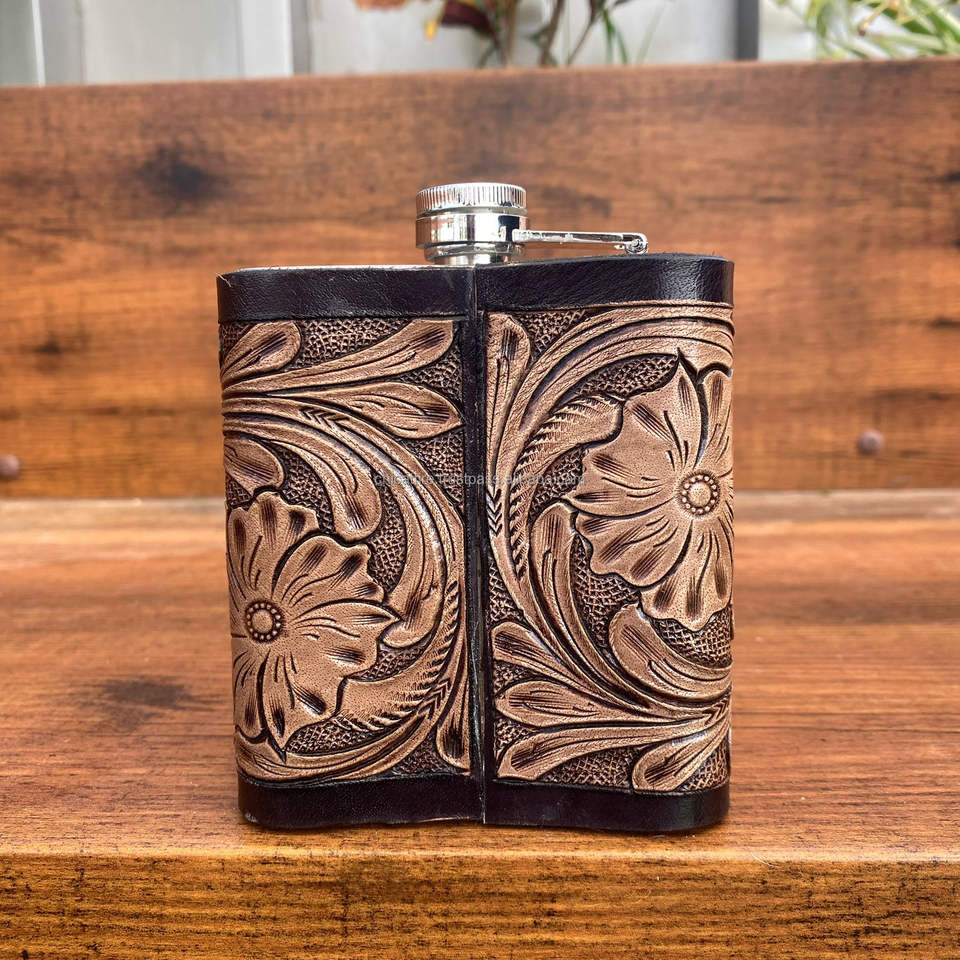 New OEM 8oz Stainless Steel Hand Tooled Leather Hip Flasks Wholesale Whiskey Pocket Flask for Alcohol Packed in Box Outdoor Use