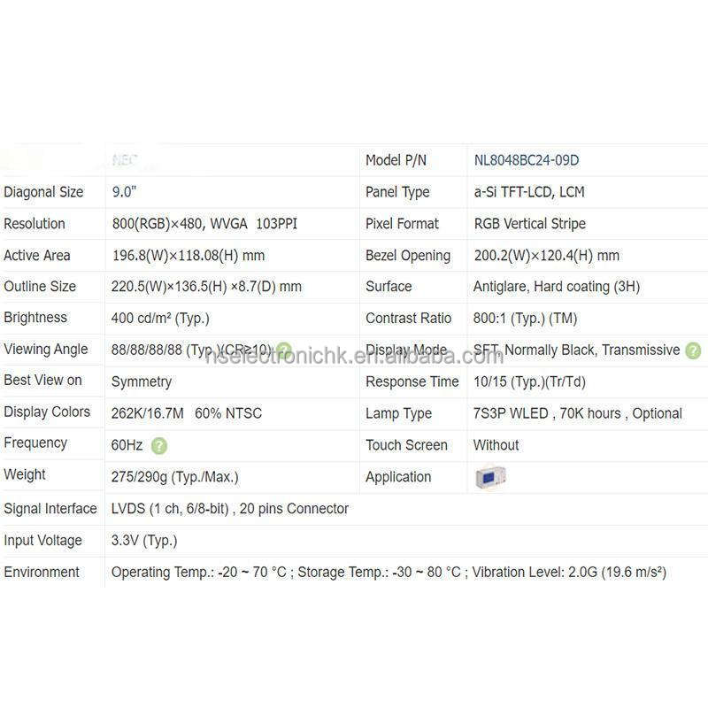 New Original In Stock 9 Inch 800×480 WVGA TFT LCD Panel For Industrial Control Automotive Equipment Display NL8048BC24-09D