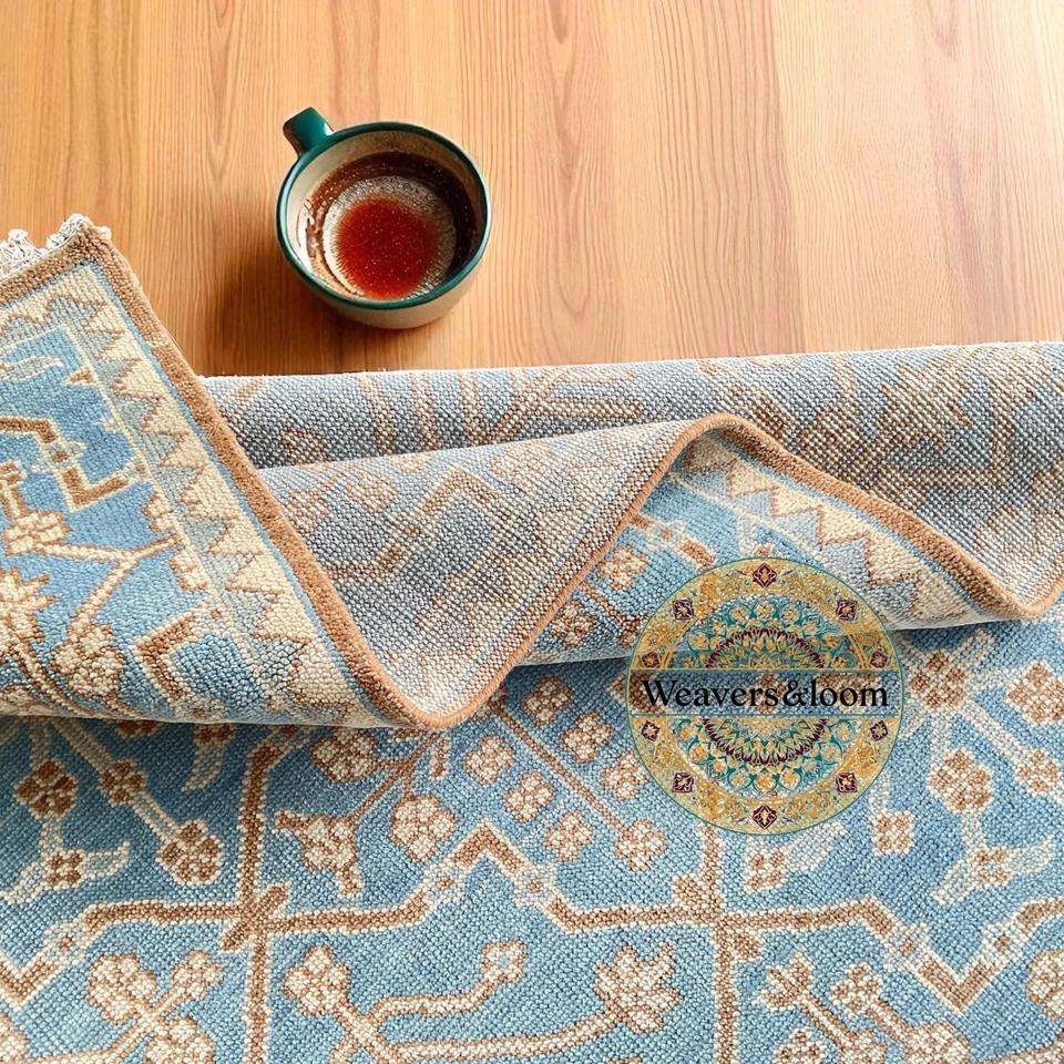 New Oushak Hand-Knotted Wool Rug Handmade Area Rug in Blue and Brown for Bedroom Living Room Dining Area & Office