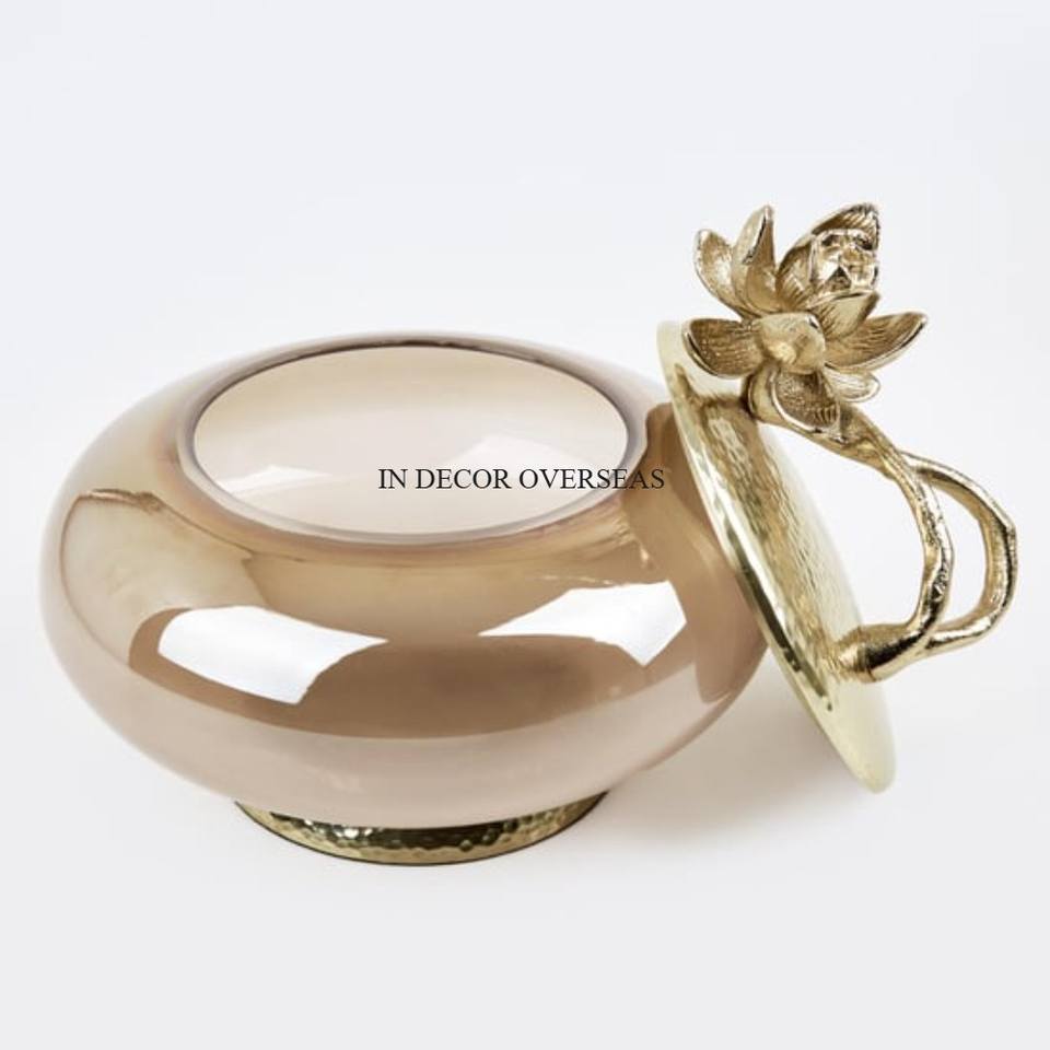 New Pattern Arrival High Standard Quality Clear Glass Made Canister With Gold Plated Metal Base And Unique Designer Top Lid