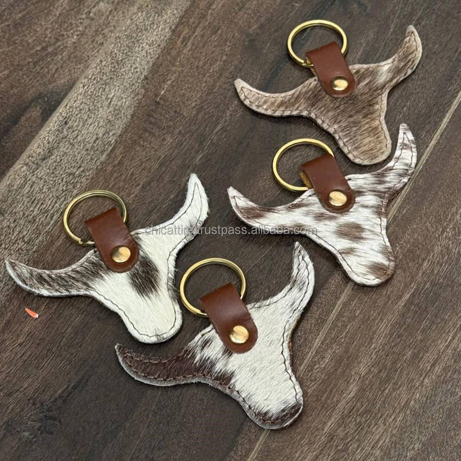 New Personalized Cute Cow Head Design Key Chain Cowhide Leather Round Key Ring Cowboy Style Charm Wholesale Keychains for Unisex