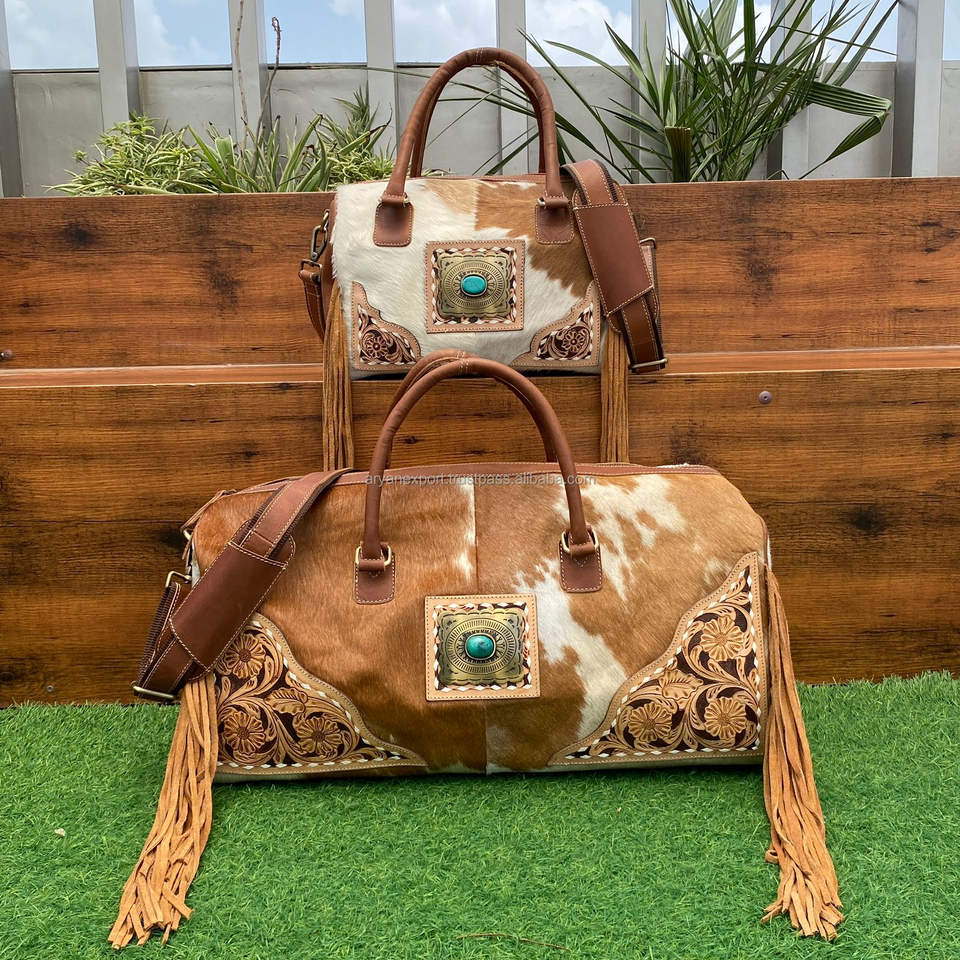 Tooled Cowhide Leather 2-Piece Fringe Duffel Combo Set