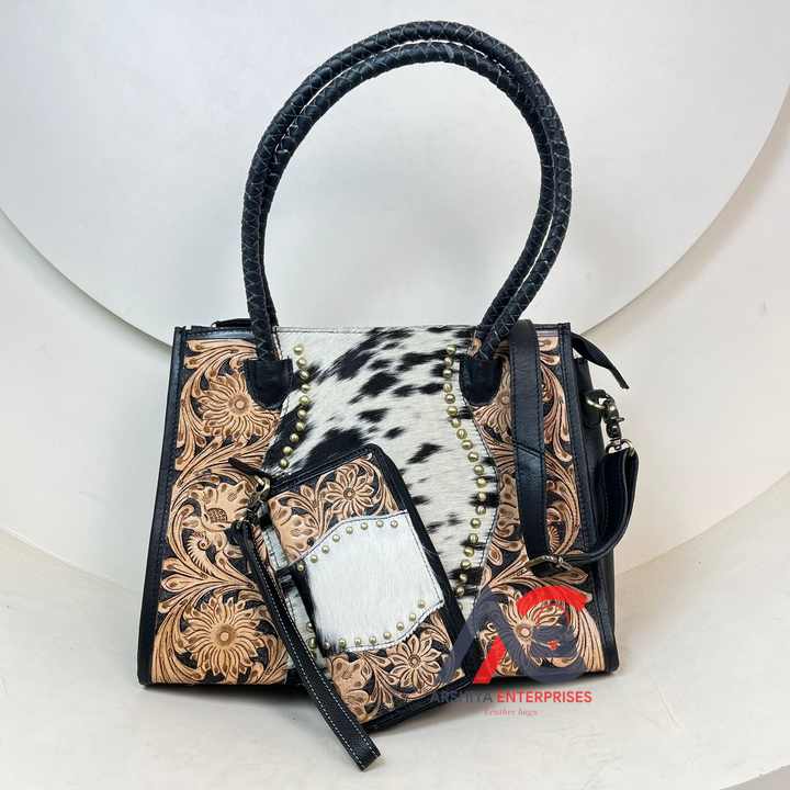New Personalized High Quality Hand Tooled Genuine Cowhide Leather Tote Bag & Wristlet Clutch for Women Luxury 2 Piece Combo Sets