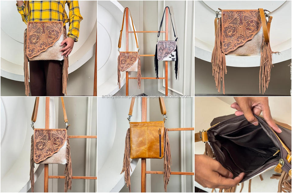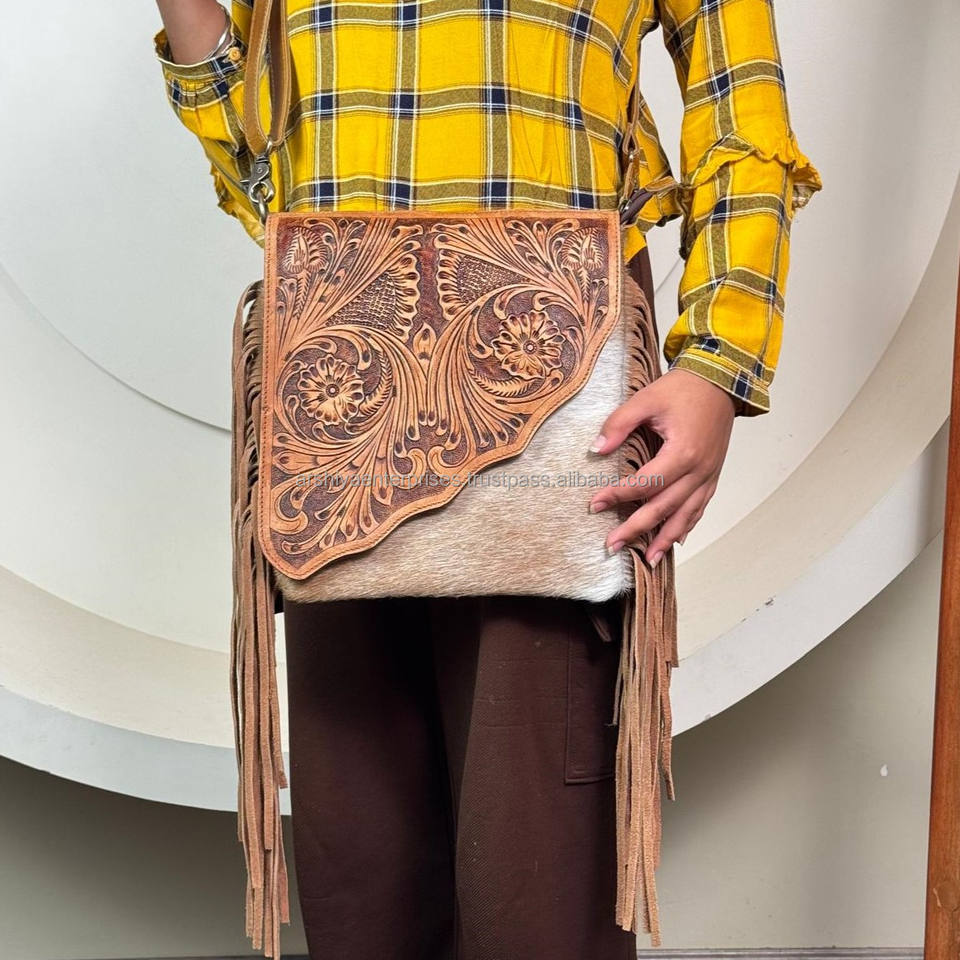 New Personalized Luxury Fringe Crossbody Hand Tooled Genuine Leather Fashion Genuine Cowhide Leather Shoulder Handbag for Women