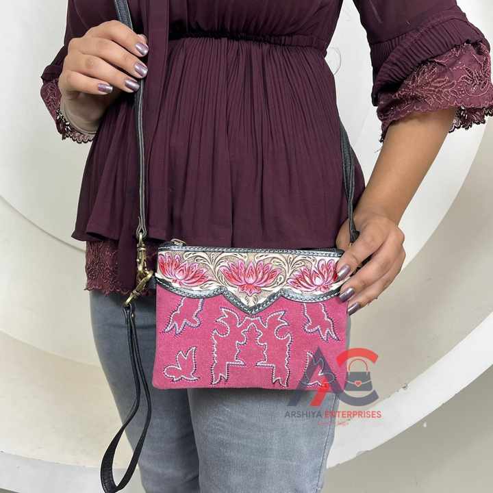 New Pink Lotus Design Hand Tooled Suede Leather Mini Bag High Quality Women Vintage Style Wristlet Sling Bag with Zipper Closure