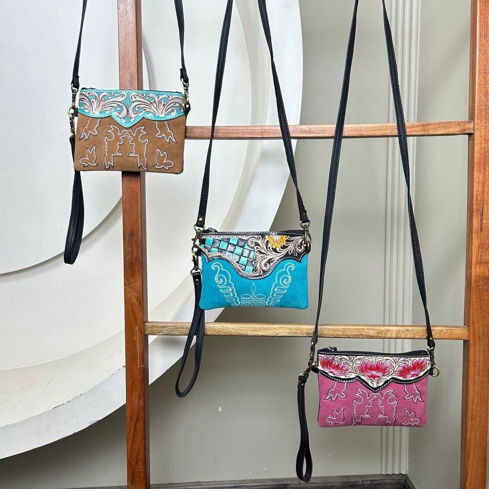 Hand Tooled Suede Leather Crossbody Bag With Wristlet
